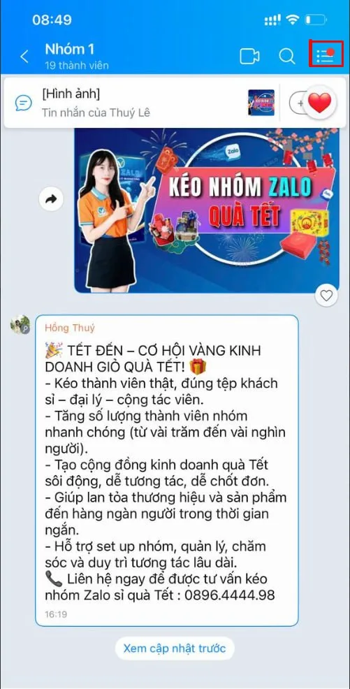 Bước 2: Truy cập vào nhóm Zalo mà bạn muốn tắt link mời, sau đó nhấn vào biểu tượng ba gạch ở góc trên bên phải màn hình.