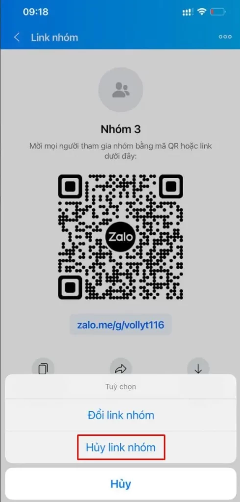Bước 4: Nhấn vào biểu tượng ba chấm (⋮) ở góc phải, sau đó chọn “Hủy link nhóm” để vô hiệu hóa liên kết.