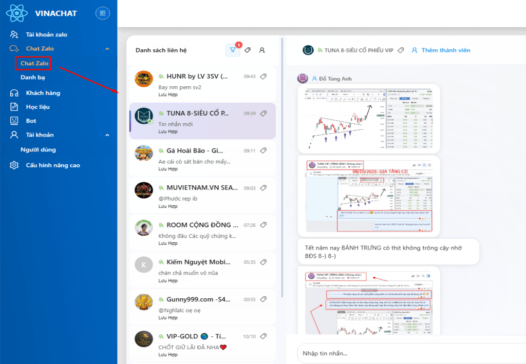 Mục ”Chat Zalo” sẽ cho phép bạn check được tin nhắn của tất cả các nick Zalo. Từ tin nhắn cá nhân cho đến tin nhắn nhóm.