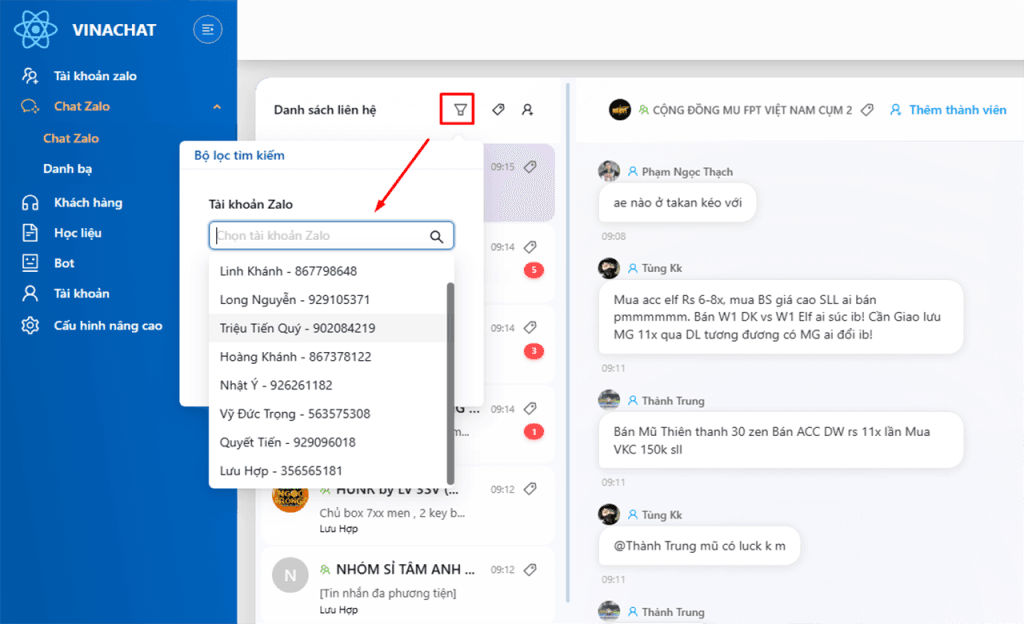 Các bạn có thể Click vào biểu tượng hình phễu và lựa chọn từng tài khoản Zalo để hiển thị tin nhắn riêng của từng tài khoản Zalo trên phần mềm.