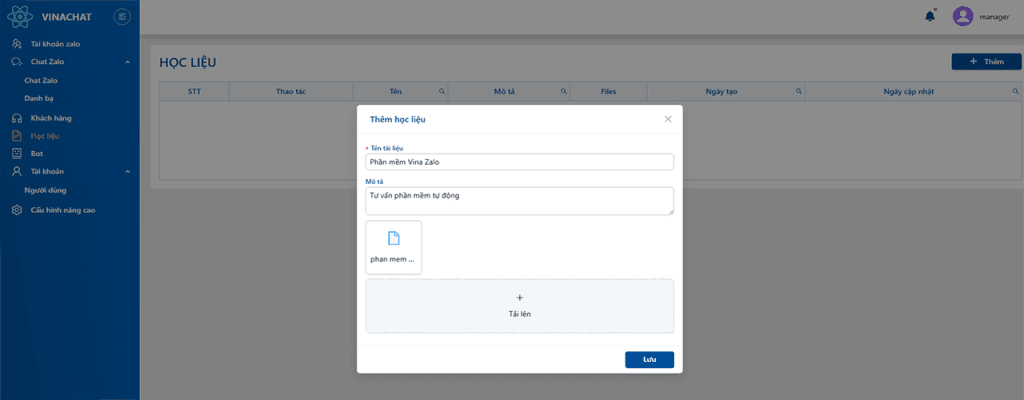 Mục học liệu và Bot cho phép bạn nhập file học liệu sản phẩm vào phần mềm. Sau đó con bot AI sẽ học sản phẩm và trả lời tự động khi khách hàng cần tư vấn sản phẩm. Việc này giúp tối ưu nhân sự trả lời tin nhắn của khách hàng. Bạn không cần phải trực máy tính, phần mềm sẽ tự động rep khách, chốt đơn.