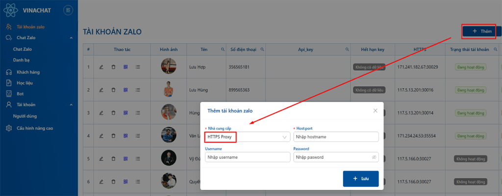 + Quét mã QR và đăng nhập trực tiếp Zalo của bạn lên phần mềm bằng cách bấm ”Thêm” nhập proxy và quét mã QR đăng nhập tài khoản là xong.