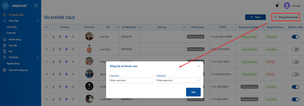 + Đồng bộ tài khoản Zalo từ bên phần mềm Vina Zalo sang Vina Chat. Ở đây bạn chọn ”Đồng bộ tài khoản” sau đó nhập Username và mật khẩu của phần mềm Vina Zalo vào để đồng bộ tài khoản từ Vina Zalo sang Vina Chat.